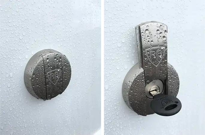 La serrure vous assure une protection optimale grâce au cylindre de haute sécurité RB-LOCKS doté d’un système anti-crochetage, anti-perçage et d’une clé brevetée uniquement reproductible dans les centres agréés. Son protège cylindre avec cache poussière intégré permet une protection parfaite contre les intempéries.